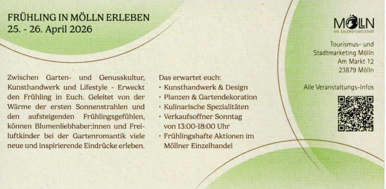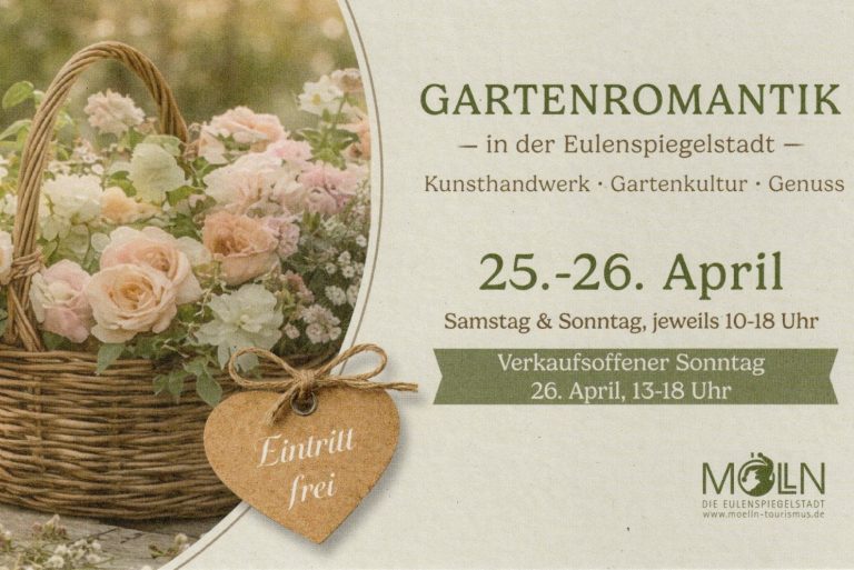 Auch in diesem Jahr haben wir wieder anlässlich der Möllner Gartenromantik am Sonntag den 26.04.2026 in der Zeit von 13.00 bis 18.00 Uhr für Sie geöffnet.